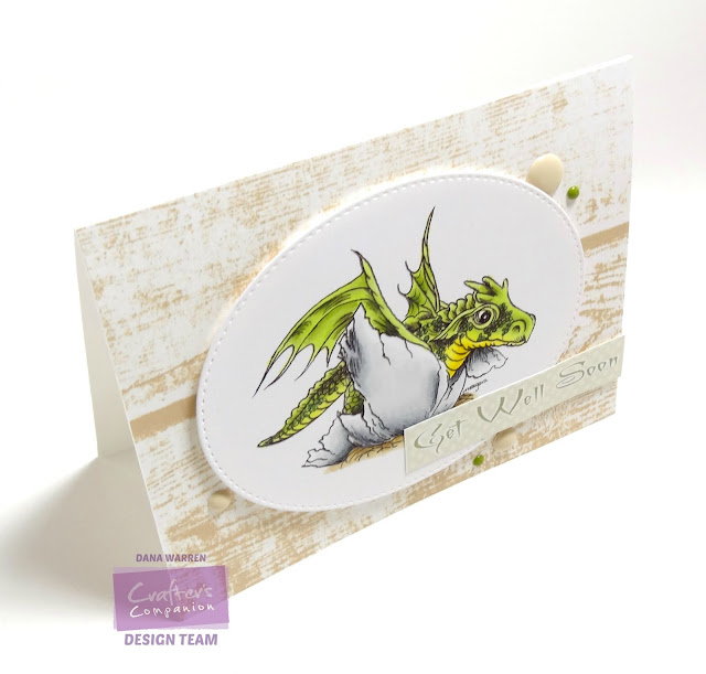 My card features just one of the many digital stamps, sentiments and a printable pattern paper. I started by printing these elements on white card stock. Then i used Spectrum Noir markers to color the little baby dragon (GT4, CT1, CT3, CG1, DG2, CG2, IG1, IG2, IG4, IG6, EB1, EB2, GB10). I used a stitched oval to cut out the image.