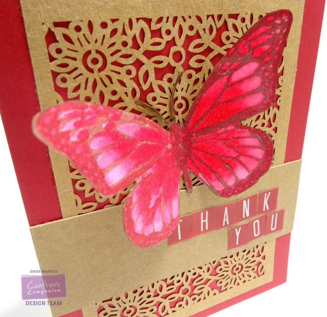I wanted to the Kraft cut piece to really stand out, so i picked out some Crafter's Companion Shimmering Card Stock, Candy Red and added it to a white card base. Then i adhered the Kraf piece on top.